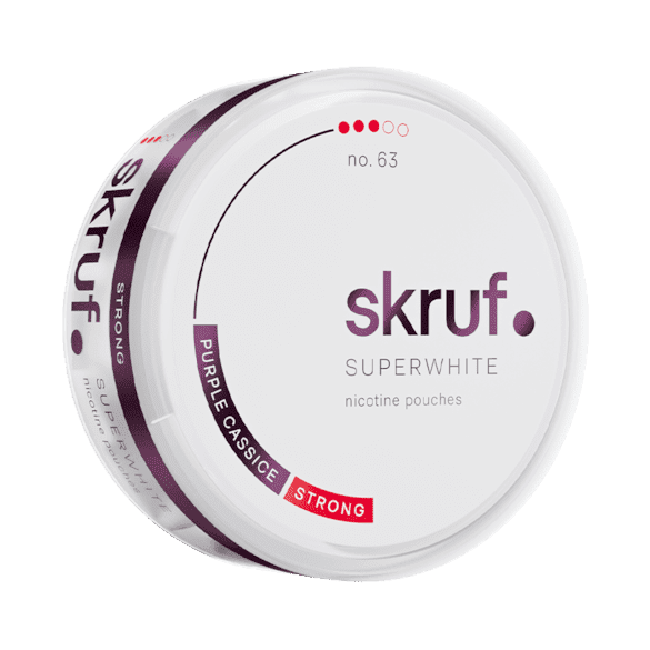 Skruf Superwhite No.63 Purple Cassice Strong är ett vitt snus från Skruf. Produkten är en tobaksfri nikotinpåse i slim-format med smak av svarta vinbär.